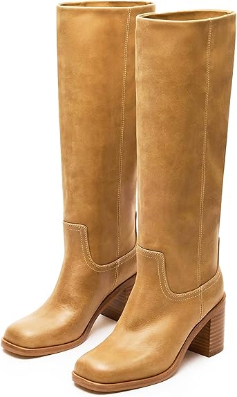 Crafted in a warm banana hue, these boots feature a sturdy block heel that provides stability while enhancing your silhouette. The square toe design offers a modern twist, and their easy-to-wear knee-high structure makes them an ideal choice for any fall occasion, blending fashion with practicality.