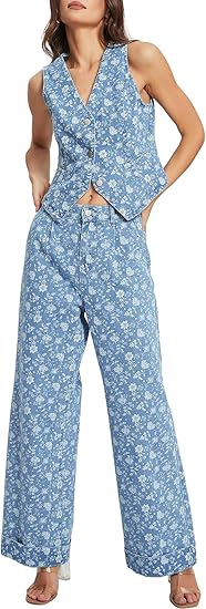 Elevate your rodeo event wardrobe with the SCOFEEL Womens 2 Piece Denim Set, featuring a stylish sleeveless button-up jean vest and wide-leg pants. This unique combination blends comfort with fashionable floral-patterned denim, making it ideal for casual, outdoor, or party occasions throughout spring and summer.